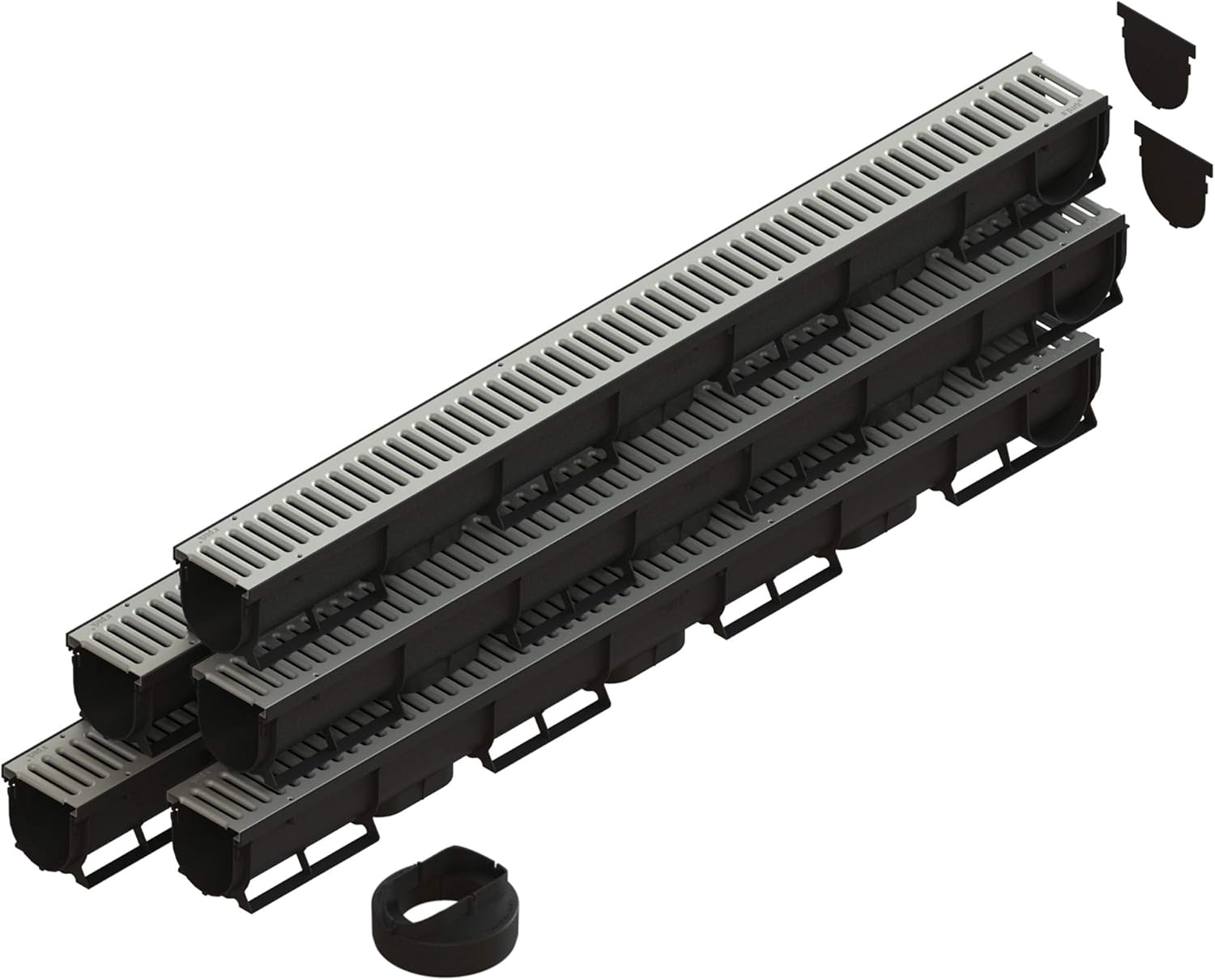 Spark 1 Premium Channels come with galvanized stamped steel grating. The grating is fastened in with custom screws in the grate for a secure hold to the channel. The channels are designed with a snap and lock connection end to end. Come with 2 end caps per package. Channels also have a 90 degree turn knockout on EACH end of the channel. No need to purchase adapters. If you ever have any quesitons, please do contact us, and we will respond immediately. Thank you very much!