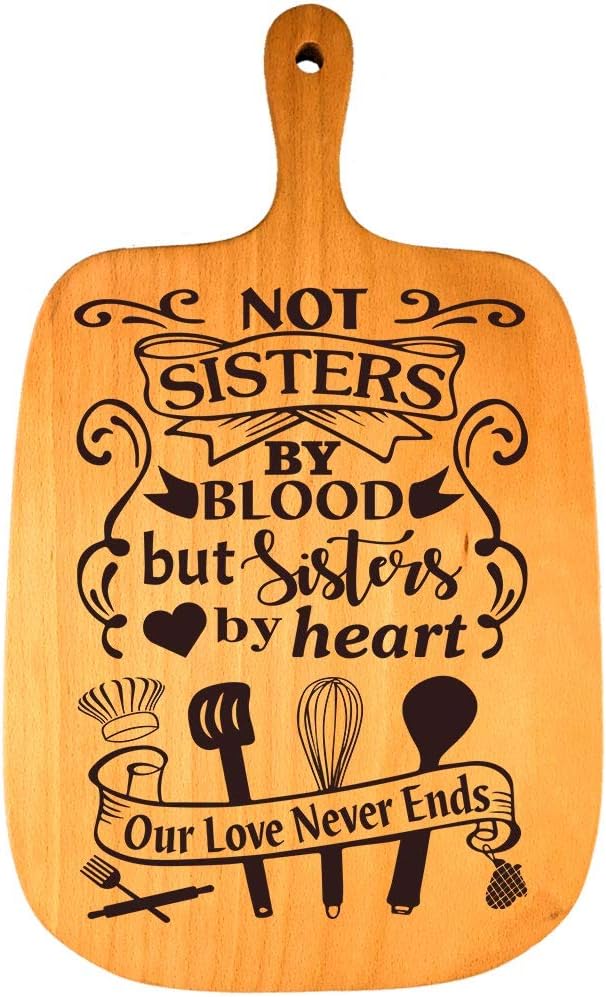 ❤【Unique Custom With Meaningful Words】❤: ☀ Giving such a special gifts is a beautiful way to tell your unique sister friend how you feel about her. ☀ This pure wooden cutting board will be of fine enough quality to last as long as your love for her. ❤【Express Your Special Feelings With Sister Friend】❤ ☀ The funny saying which is engraved on the front is a plus sign. ☀ No more words describe her more perfect than these.This unique cupconveysyour blessing to her perfectly. ❤【Strong Corrosion Resistance】❤: ☀ We used pure solid wood,although the cost was increased,but it will be morestronger resistant to corrosion than the bamboo on the market. ☀ The back side is designed for culinary cutting board usage,cheese or appetizer serving tray. ❤【Really Saving For You】❤: ☀ Our cutting boards are double-sided! ☀ The engraved side can be displayed as a beautiful piece of kitchen decorand the back of the board can be used for cutting and serving. ☀ Our eco-friendly custom engraved cutting boards are a very unique andfun way to add something new and different to your kitchen. ★【Funny Decor & Practical】★: ☀ This wooden cutting board measures 8.8"W x 13.3"L x 0.7"H and weighs 1.5lbs. ☀ It provides enough space for vegetable chopping,slicing fruits,cheeses. ☀ Your sister friend will most likely treasure this one as a kitchen decor and hang it in her kitchen for years to come. ❤【Perfect Shopping Experience】❤☀ Our cutting board are made from pure wooden and are backed by themanufacturer's lifetime ensure.☀ Special process to ensure that the engrave does not fall after cleaning.☀ We back our wooden cutting board with 100% Money Backand prompt, friendly Customer Service, to help you buy with confidence.